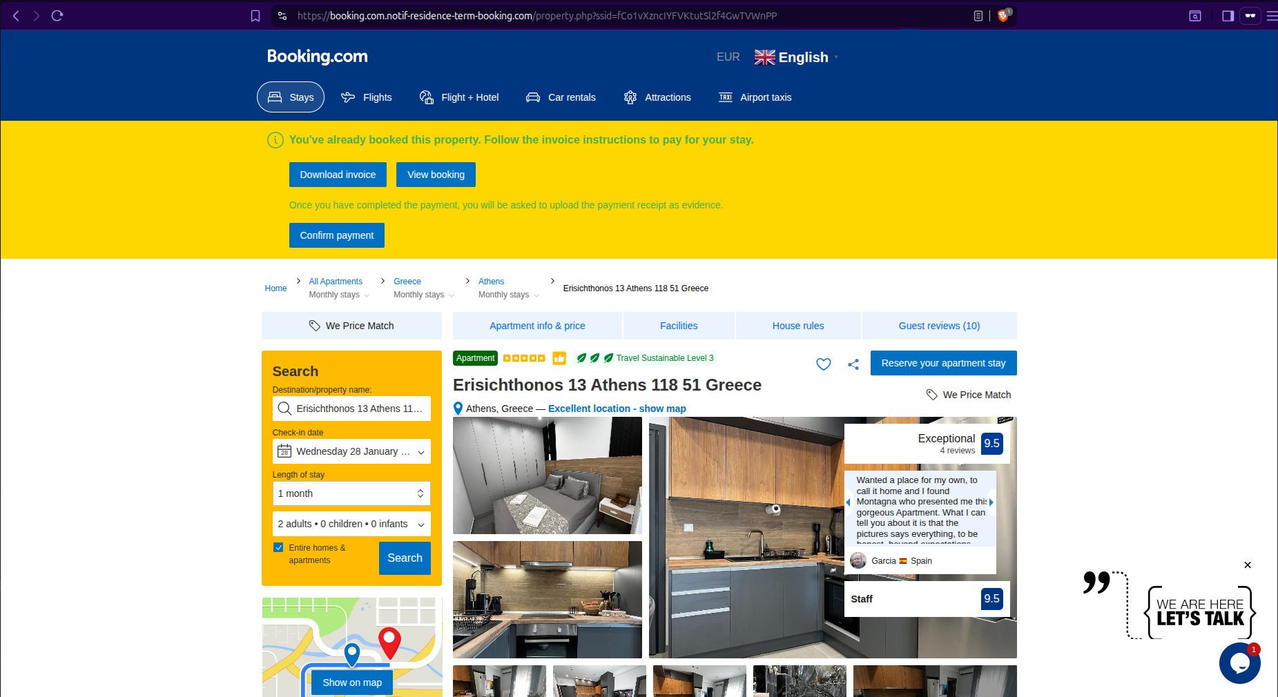 Η σελίδα δείχνει ότι η κράτηση είναι “confirmed” αλλά η πληρωμή εκκρεμεί.